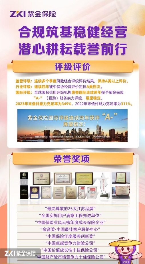紫金财产保险股份有限公司(简称“紫金保险”)成立于2009年5月,总部位于南京市,是江苏省首家全国性财产保险公司,注册资本60亿元人民币。作为省财政厅主管的国有大型金融企业,紫金保险在江苏金融四梁八柱体系中占据重要位置。公司以“管理风险,创造价值”为使命,秉承“责任、专业、创新”的理念,倡导“以客户为中心”的经营文化、“绩效优先”的执行文化和“人才优先”的用人文化,实现了高起点组建、远战略规划、全国性布局。目前,紫金保险覆盖全国21个省份,铺设机构逾500家,员工队伍约6000人,客户人数超2000万。公司保持快速发展,自2012年起实现持续盈利,保险业务收入超过761亿元,总资产超过214亿···